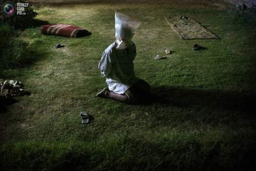 Bilden visar en person som bundits och fått plast virat runt sitt huvud medan man söker igenom bostaden. Praxis i Afghanistan och Irak från USA´s sida att gå tillväga på det sättet.